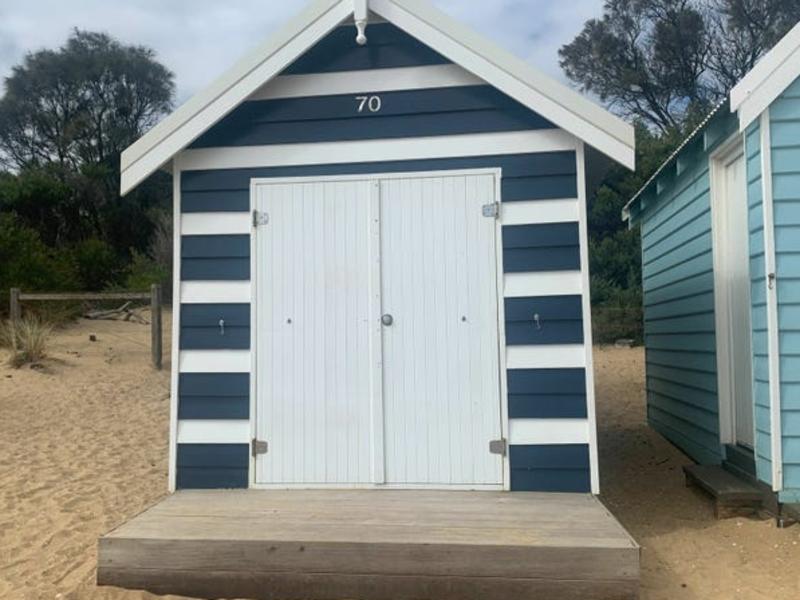 The blue shack with a yellow door is listed with Warlimont & Nutt Mt Martha’s