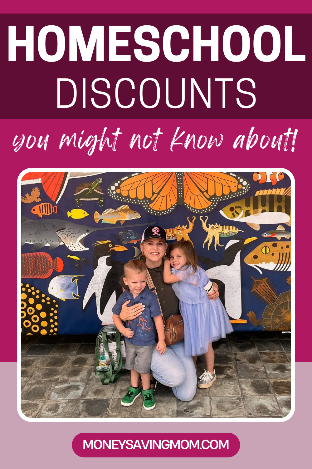 A smiling woman kneels between two young children in front of a colorful mural featuring butterflies, penguins, and fish. The top of the image includes bold text that reads “Homeschool Discounts You Might Not Know About” and the bottom displays the website “MoneySavingMom.com.”