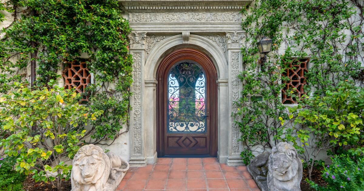 Right here, Williams deployed coffered ceilings, decorative ironwork, stained-glass home windows and colourful tile throughout two tales and almost 9,000 sq. ft. Along with 10 bedrooms and 11.5 loos, there’s a wood-paneled library, wine cellar, pub and hidden bookshelf door that results in the decrease degree.