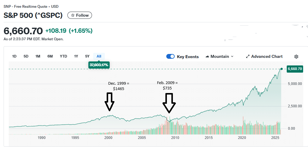 For these of you who don’t bear in mind, at it’s peak valuation the S&P 500 was priced at $1,465 in December 1999. In the course of the ensuing decade, because the dot com increase ended and the tech bubble burst, the inventory market fell to $735 in February 2009.