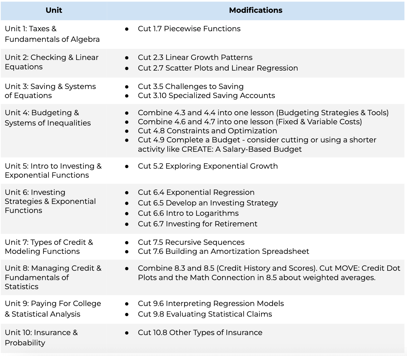 - Unit 9: Paying For Faculty & Statistical Evaluation – if you realize college students will be taught this content material elsewhere, you might skip this unit as properly.