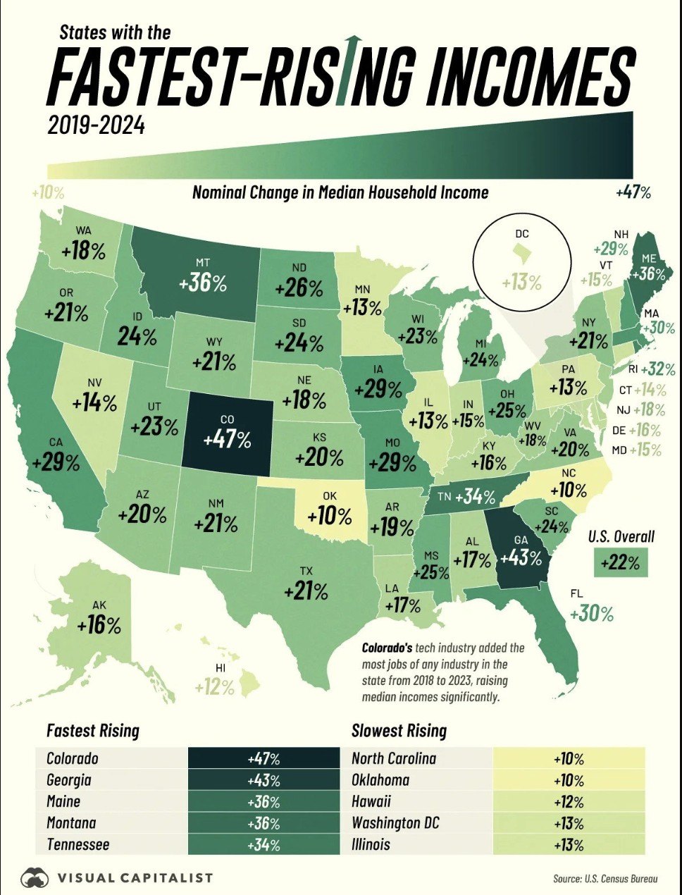 In line with knowledge from the U.S. Census Bureau, the state that noticed the most important soar was Colorado, the place incomes elevated by a whopping 46.9%.