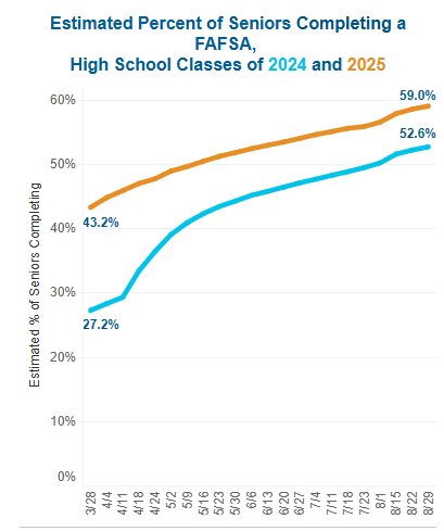 “By means of August 29, 2024, 59.0% of the highschool class of 2025 has accomplished the FAFSA. There have been 2,445,350 completions nationally, a +14.% change in comparison with the identical date final FAFSA cycle.”