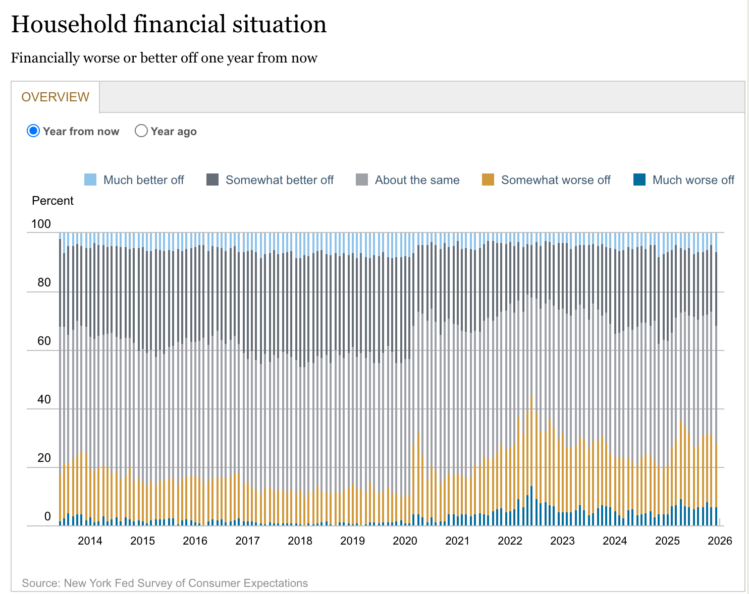 “Perceptions about households’ present monetary conditions in comparison with a 12 months in the past improved, with a smaller share of households reporting a worse monetary state of affairs and a bigger share of households reporting a greater monetary state of affairs. 12 months-ahead expectations about households’ monetary conditions additionally improved, with a smaller share of households anticipating a worse monetary state of affairs and a bigger share of households anticipating a greater monetary state of affairs (the very best since February 2025) in a single 12 months from now.”