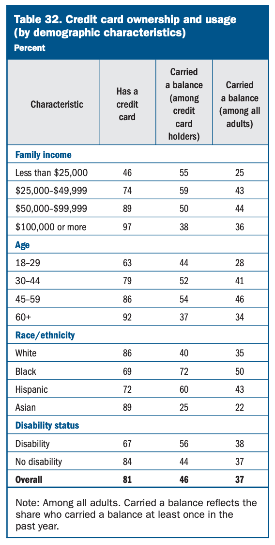 “Whereas bank card possession has elevated over the previous decade, carrying a bank card stability has change into much less prevalent. In 2024, 46 p.c of bank card homeowners mentioned they carried a stability at the very least as soon as in the course of the prior 12 months, down 11 proportion factors since 2015 (determine 28).
