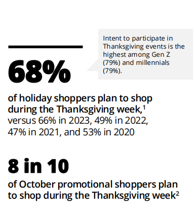 “Customers surveyed are keen to loosen their purse strings this season, however a cost-of-living squeeze continues to weigh on vacation customers. Survey findings point out that customers in all revenue teams are displaying frugal and value-seeking behaviors regardless of optimism across the financial system. To maintain the vacations festive, they’re making tradeoffs and searching for out offers with 75% planning to take part in October and November promotional occasions (versus 61% in 2023). With 5 fewer purchasing days this yr, these promotional occasions could also be essential to tempt shoppers to buy early.”