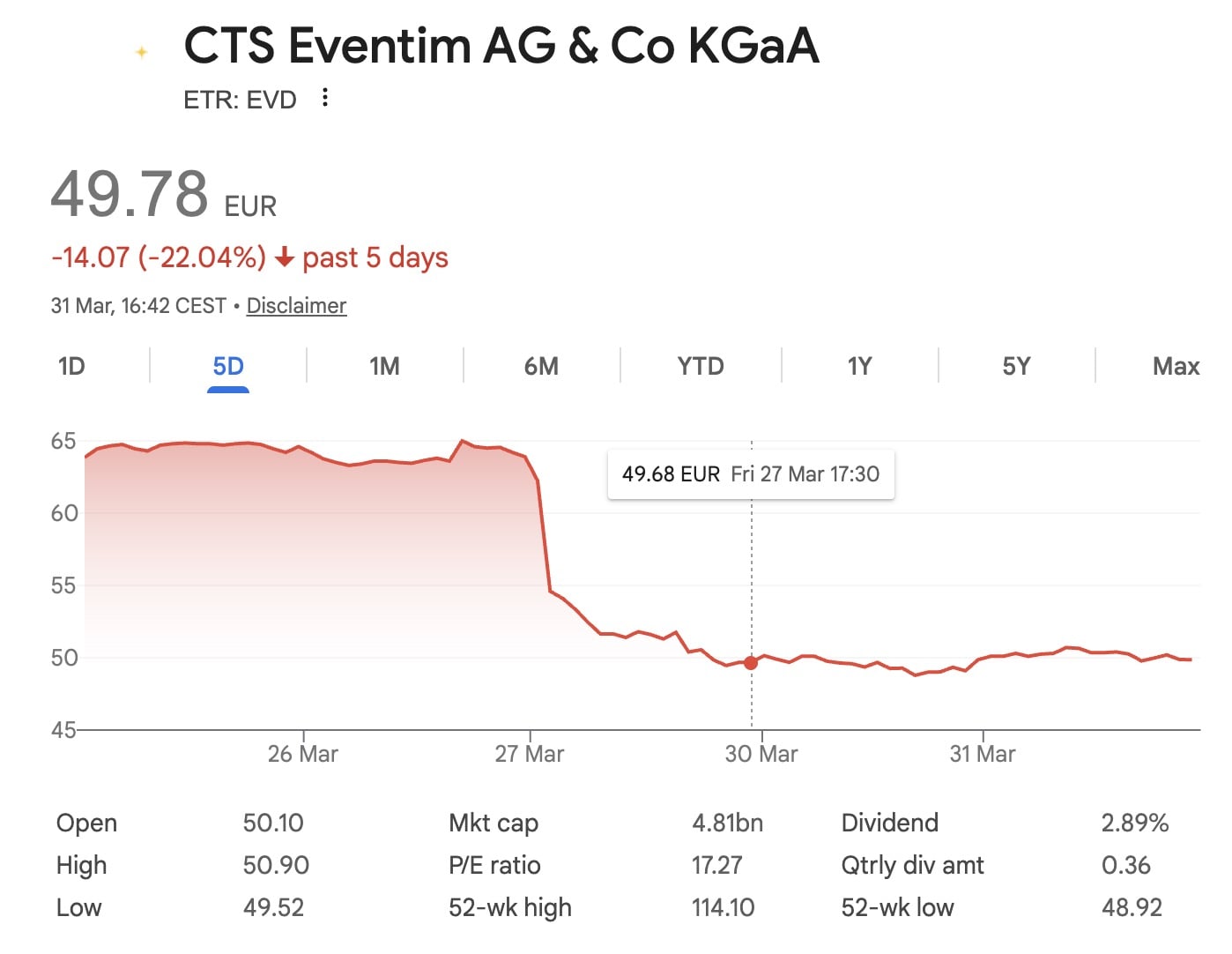 Regardless of the sturdy top-line outcomes, CTS Eventim’s inventory has fallen greater than 21% because the outcomes had been revealed, dropping from round €64 to round €50 on Tuesday (March 31), giving the corporate a market capitalisation of round €4.8 billion ($5.1bn).